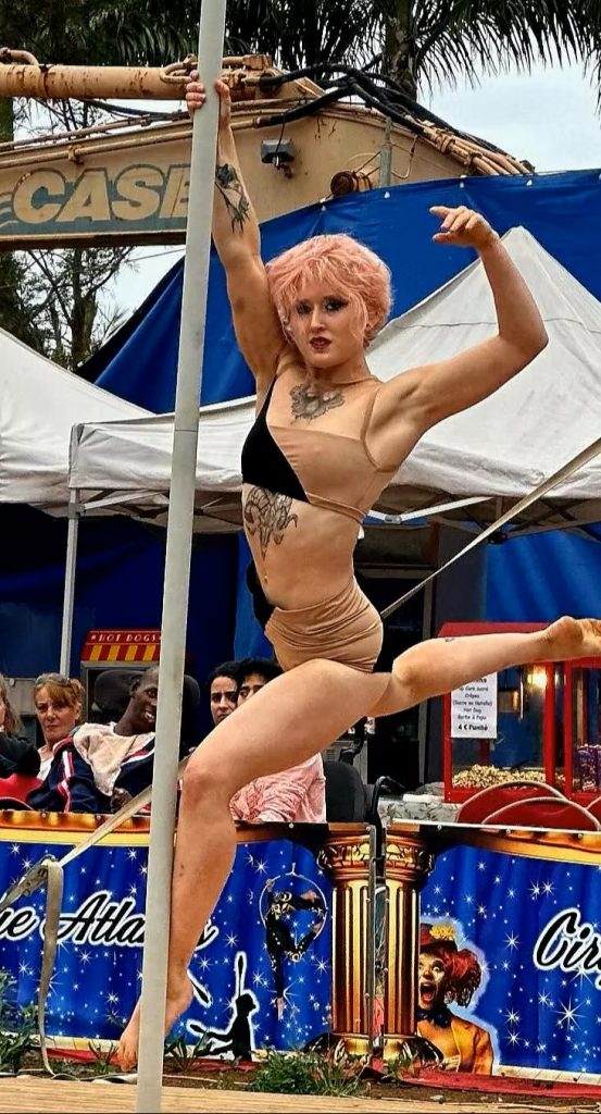 Pole Dance trifft auf rockige Musik und klare Choreografie. Die Performance verbindet Ausdruckskraft mit körperlicher Präzision.