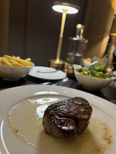 Die „Hummerbisque“ ist der perfekte Einstieg – eine cremige, samtige Suppe, die mit geschmorten Strauchtomaten und einem Hauch Pimiento-Olivenöl verfeinert wird. Schon beim ersten Löffel entfaltet sich ein harmonischer, leicht fruchtiger Geschmack, der sich wundervoll mit dem klaren Hummeraroma verbindet. Diese Suppe ist nicht nur rund und ausgewogen, sondern auch so köstlich, dass man sich kaum zurückhalten kann, den letzten Löffel zu genießen. Auch die Hauptgerichte enttäuschen nicht: Das „Steak Frites“ mit zartem Rinderfilet, goldbraunen Pommes Frites und einer perfekten Sauce Béarnaise ist ein wahres Fest für Fleischliebhaber.