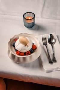 Zum Dessert treffen internationale Aromen auf köstliche Patisserie: Die Piña Colada mit Kokos und gegrillter Ananas bringt frische, tropische Leichtigkeit auf den Teller, während die Pavlova mit Waldbeeren und Vanilleeis mit luftigem Baiser, süßen Beeren und zarter Cremigkeit begeistert– ein perfekter süßer Abschluss für den Abend.