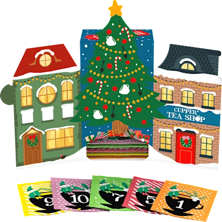Einmal durchatmen, Tee aufgießen, genießen – der Cupper Teas Adventskalender 2025 verwandelt jeden Dezembermorgen in einen Moment der Ruhe. Das liebevoll illustrierte Design zeigt ein britisches Städtchen mit ausklappbaren Türen und einem festlich geschmückten Weihnachtsbaum in der Mitte – ein echter Hingucker im Advent.