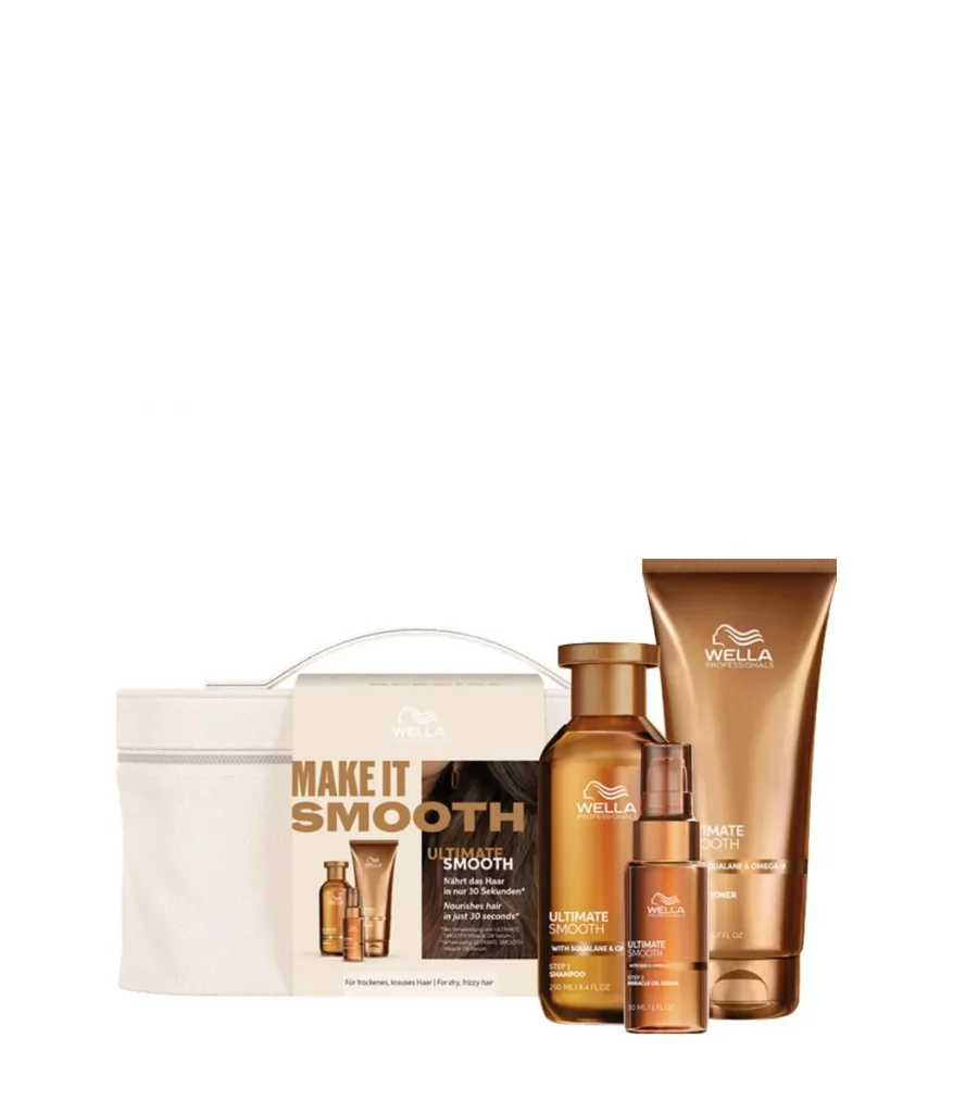 Für Haar, das sofort glänzt und sich seidig anfühlt, ist das Ultimate Smooth Set perfekt. Shampoo und Conditioner verschmelzen zu einem Verwöhnerlebnis, das Frizz bändigt und die Haarstruktur nährt. Das Miracle Oil Serum sorgt zusätzlich für maximale Geschmeidigkeit und einen unwiderstehlichen Glanz. Jede Haarwäsche sorgt für samtweiche Strähnen, strahlenden Glanz und ein gepflegtes Finish – ein echter Verwöhnmoment für jeden Tag. Wella, ca 64,90 Euro.