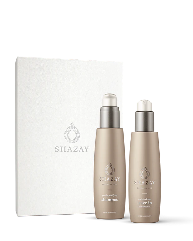 Das Gentle Purifying Shampoo reinigt sanft, ohne auszutrocknen, und schenkt dem Haar spürbare Leichtigkeit und Vitalität. Der Moisturizing Leave-In Conditioner pflegt, entwirrt und sorgt sofort für Geschmeidigkeit – perfekt auch als schneller Locken-Refresh am zweiten Tag. Das Haar fühlt sich nach jeder Anwendung weicher, hydratisierter und einfach gesünder an. Shazay, ca. 74,00 Euro.
