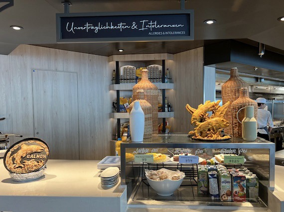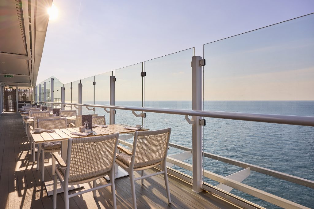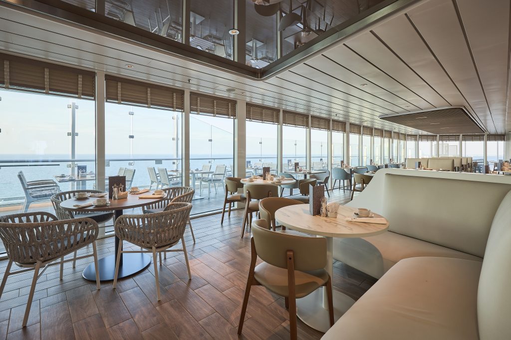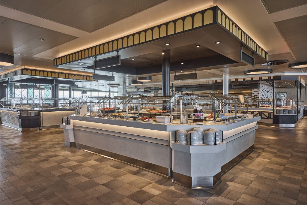 Der lichtdurchflutete Raum bietet einen fantastischen Panoramablick zu beiden Seiten des Schiffs und im kleinen Außenbereich kann man gleich morgens die frische Seeluft genießen. Tagsüber und abends lädt der Harbour Market zu einer kulinarischen Rundreise ein.