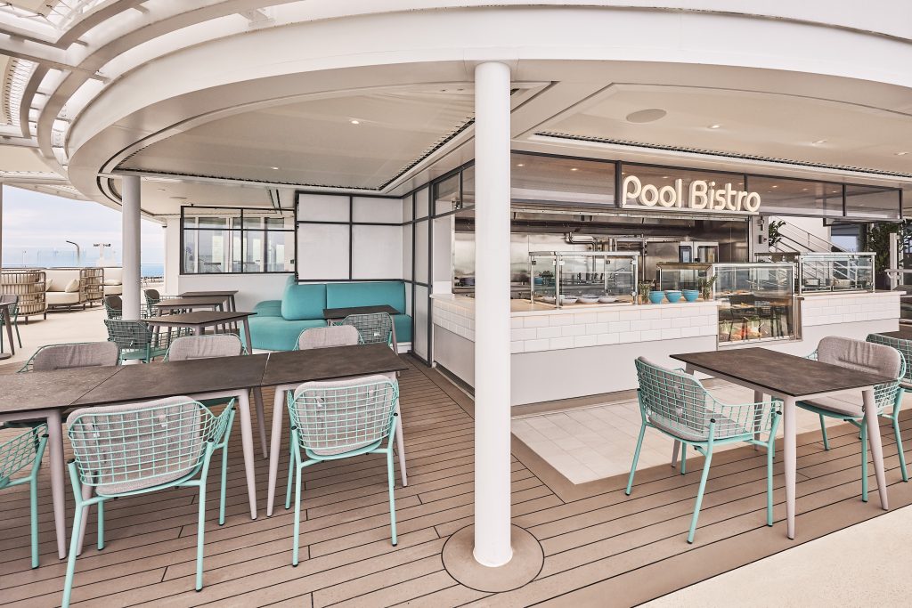 Auf Deck 17 laden das Pool Bistro und das Pane e Sole Bistro zu kleinen Auszeiten mit leichten Snacks ein. Hier erwarten die Gäste Mahlzeiten für zwischendurch und erfrischende Getränke.