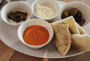 Die Karte bietet griechische Klassiker wie Gyros, Souvlaki, Bifteki und cremiges Tzatziki. Wer es leichter mag, wählt Melitzana kai Feta oder das feine Doradenfilet „Tsipoura“ mit Muscheln, Gemüse in griechischer Kakavia-Sauce und cremigem Spanakorizotto.