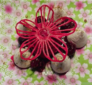 Japanisches Kirschblütenfest – Sorbet von Kirsche, Cremeux von Mandelmilch mit Kirschblütenblättern, grünem Pfeffer und Pistazien; dazu Rozu Rosé von André Macionga Cuvée.