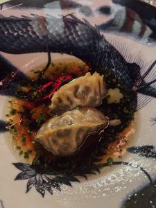 Kalligrafie – Sud aus Pilzen und Trüffel mit Nussbutter, Gyoza gefüllt mit Jakobsmuschel und Schweinebauch, Wasserkastanien, gebratene Pilze und Thymianblätter; dazu Sake Kameman Genmai.