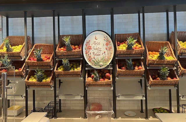 Vom frischen Salat über herzhafte Klassiker wie Currywurst bis zu wechselnden Spezialitäten gibt es eine große Auswahl. Getränke können direkt am Buffet selbst gezapft werden oder an der gegenüberliegenden Mein Schiff Bar, die ebenfalls rund um die Uhr geöffnet ist.